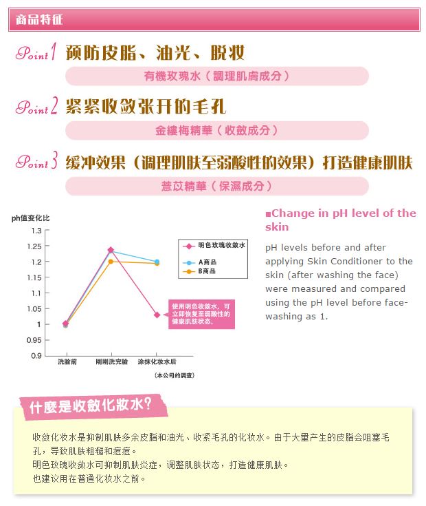 将洗完脸后的肌肤调理至弱酸性,打造健康肌肤的玫瑰收敛水。 也可在普通化妆水之前使用。